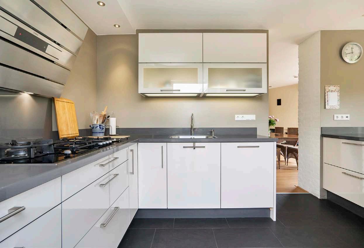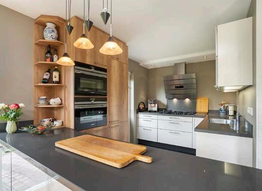 De open keuken, gerenoveerd in 2015, is volledig uitgerust met inbouwapparatuur en biedt alles wat je nodig hebt. Met een ingebouwde koelkast met vriesvak, een 5-pits gasfornuis, een combi-magnetron en stoomoven, een Quooker, een vaatwasser en een schuine wandafzuigkap, is deze keuken een droom voor iedere thuiskok. Een deur naar de tuin maakt het eenvoudig om van binnen naar buiten te bewegen om buiten te eten.
