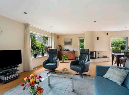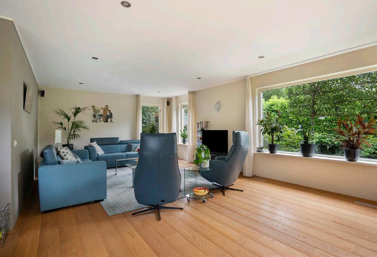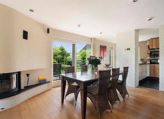 Via een moderne stalen deur kom je in de ruime woonkamer, voorzien van een houten vloer, open haard en strak spackwerk, wat een moderne en sfeervolle uitstraling geeft. De royale eettafel en zithoek maken de ruimte compleet, en door de schuifpui heb je direct toegang tot de groene tuin.