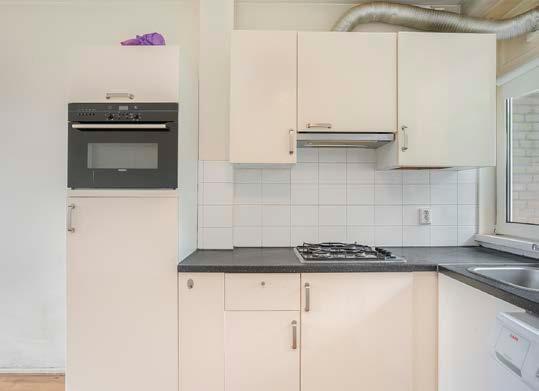 De keuken in deze woning heeft een gedateerde uitstraling. Het geheel is voorzien van een koelkast met vriesvak, een magnetron, een 4-pits gaskookplaat, een afzuigkap en een wasmachine.