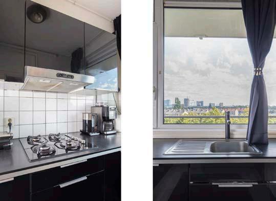De zwarte hoogglans keuken is vernieuwd in 2012 en is gelegen aan de voorzijde van het appartement. Je bent voorzien van veel kastruimte en diverse inbouwapparatuur, zoals een vaatwasser, koelkast met vriezer, 4-pits gaskookplaat en afzuigkap. Ook beschik je over een vaste kast.