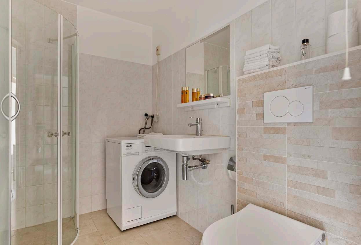 De badkamer biedt een strakke, moderne uitstraling en is uitgerust met een inloopdouche en stijlvolle wastafel, waardoor elke ochtendroutine een genot wordt.