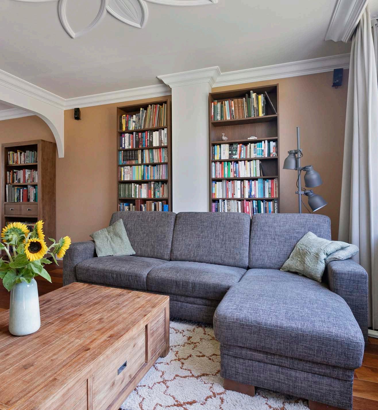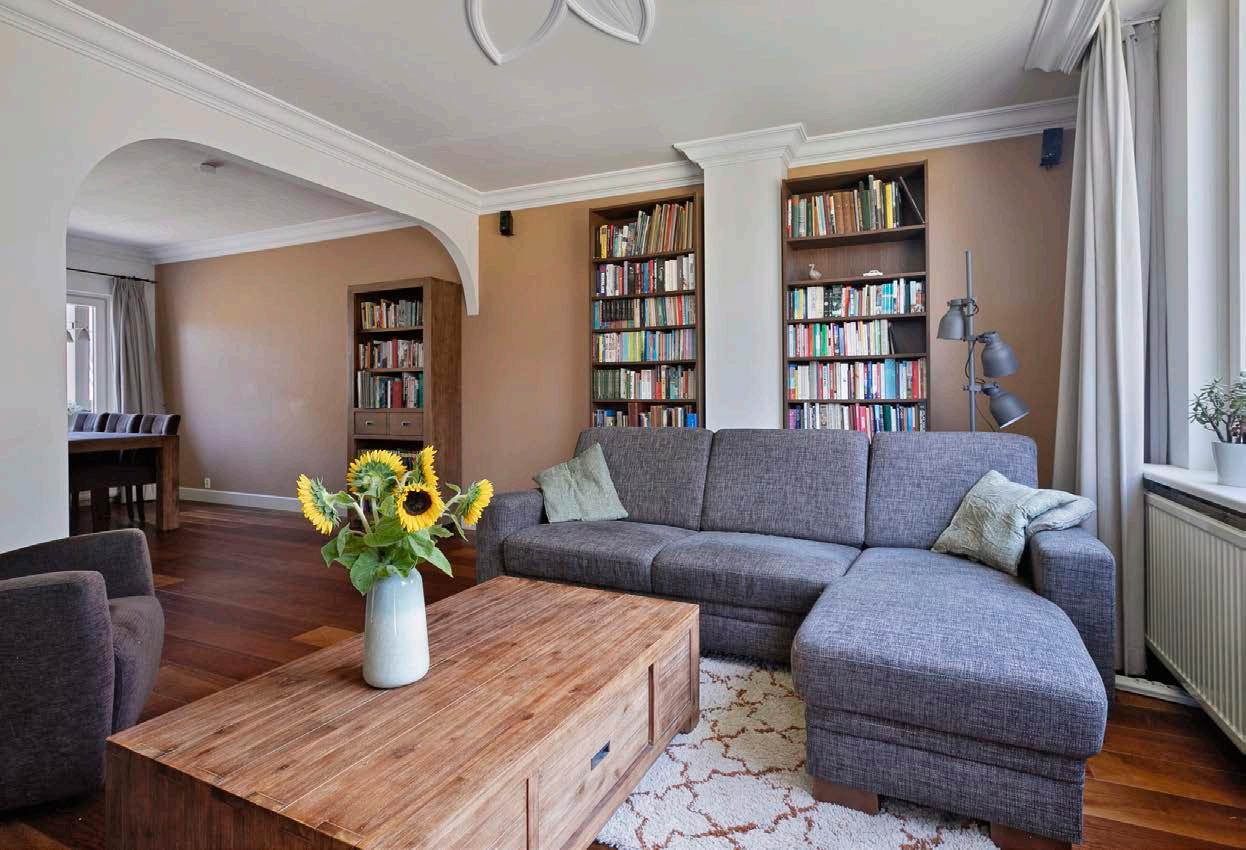 De royale woonkamer biedt veel leefruimte en heeft een prachtig hoog plafond, wat bijdraagt aan een gevoel van openheid en luxe. Grote ramen zorgen voor overvloedig daglicht, waardoor de ruimte nog uitnodigender en luchtiger aanvoelt. Dit is de perfecte plek om te ontspannen, te entertainen of gewoon te genieten van je eigen oase van rust midden in de stad.