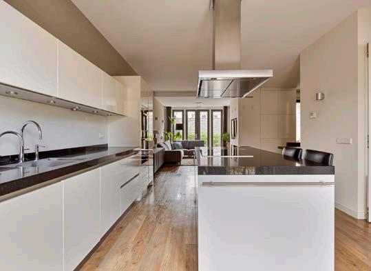 De uitgebreide keukeninrichting biedt een modern kookeiland en is voorzien van alle benodigde apparatuur, waardoor het een ideale ruimte is voor zowel dagelijks koken als het ontvangen van gasten. Het kookeiland fungeert als centraal punt voor kookplezier en sociale interactie, terwijl de hoogwaardige apparatuur zorgt voor efficiëntie en gemak in de keuken, wat elke kookervaring verrijkt.