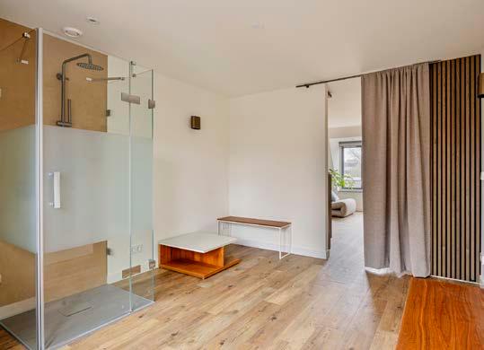 De opmaat gemaakte design trap bereik je de verdieping boven de aanbouw met 2 kamers waarvan een ook een douche en fraaie wastafel bevat.