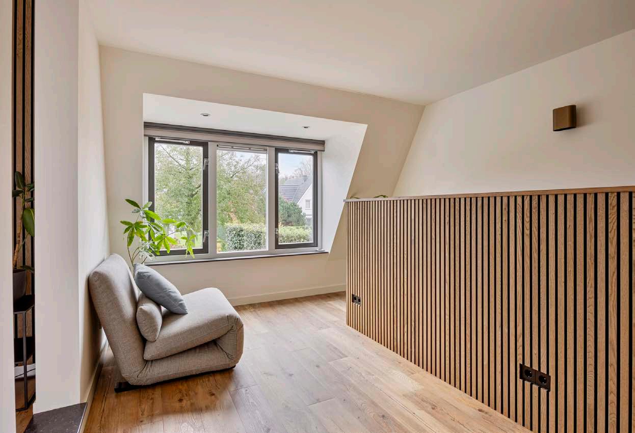 De begane grond beschikt over een ruime en gezellige zithoek bij de gashaard, ideaal voor ontspanning en familiebijeenkomsten. In de woonkamer staat comfort en gezelligheid centraal. Via stijlvolle taatsdeuren is er toegang tot een compacte sportruimte, waardoor je eenvoudig kunt switchen tussen ontspanning en activiteit binnen dezelfde uitnodigende omgeving.