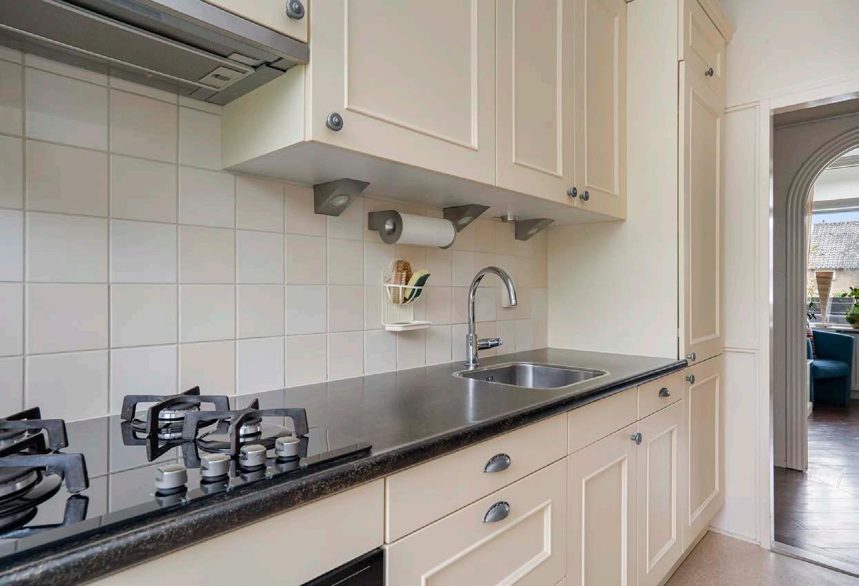 Er is een dichte keuken aanwezig, waar een keuken in een praktische rechte opstelling is geplaatst. De ruimte is afgewerkt met zeil op de vloer en tegels en behang op de wanden. In de keuken beschik je over voldoende kast- en werkruimte en daarnaast ben je hier voorzien van een 4-pits gasplaat, afzuigkap, combi-oven, koel-/vriescombinatie en een vaatwasser (2021).