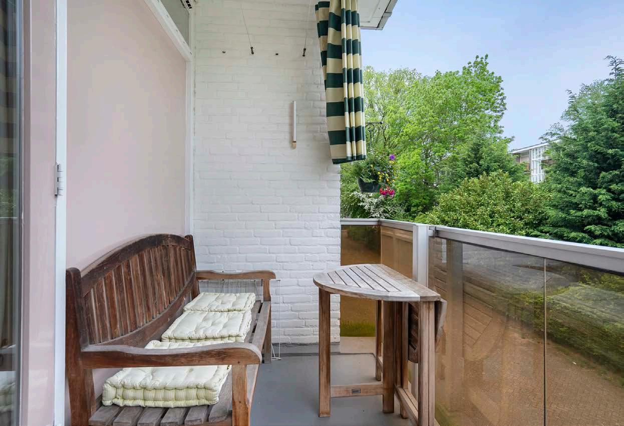 Het balkon bij de woonkamer biedt een leuk zicht op de groene omgeving en is gelegen op het westen.