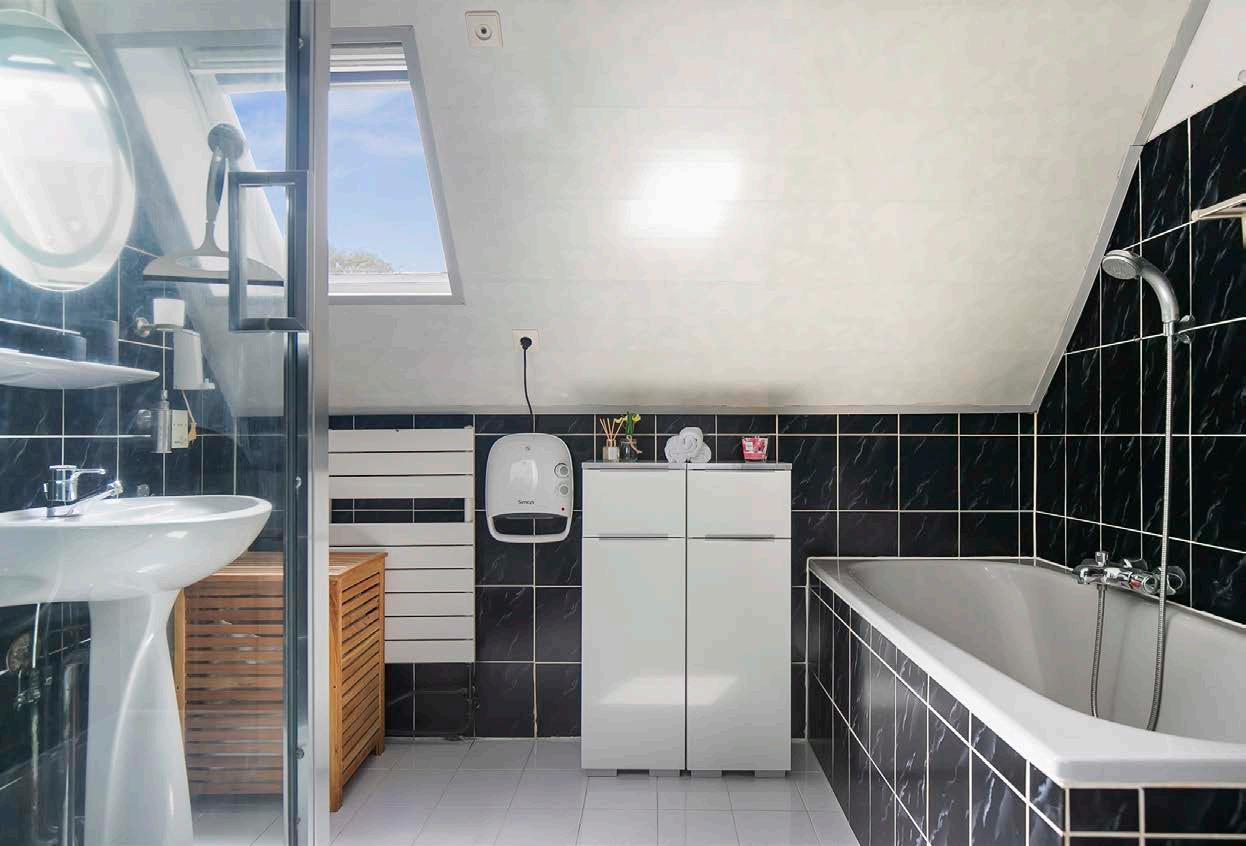 De badkamer is ruim opgezet en met een wastafel, aparte douche en een heerlijk ligbad van alle gemakken voorzien. Bovendien zorgt het grote dakraam voor veel lichtinval en natuurlijke ventilatie.
