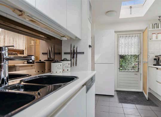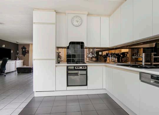 De half open keuken aan de achterzijde is geplaatst in een royale hoekopstelling met zowel onder- als bovenkastjes en biedt hiermee lekker veel werk- en opbergruimte.