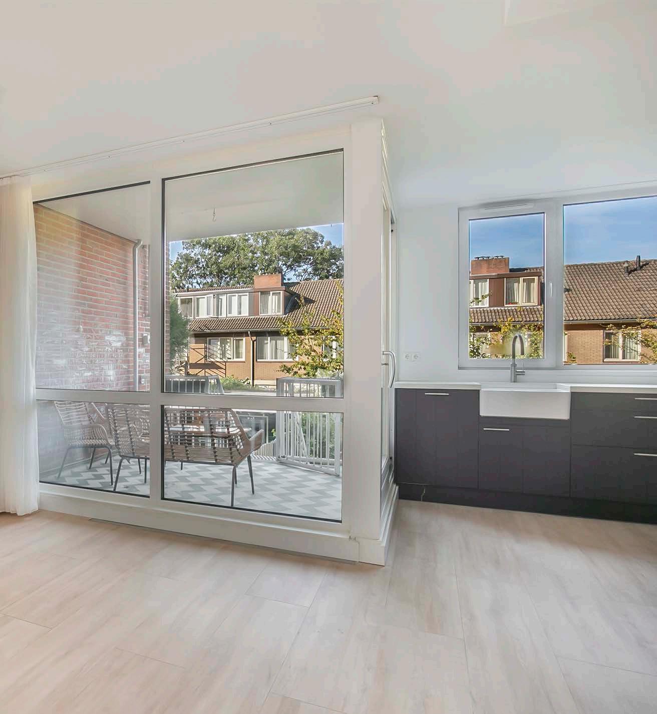 De woonkamer met geschakelde open keuken aan de tuinzijde is voorzien van een heerlijke loggia. Niet alleen een bron van licht, want op het westen, maar ook een fijne buitenruimte om tot diep in de avond te zitten