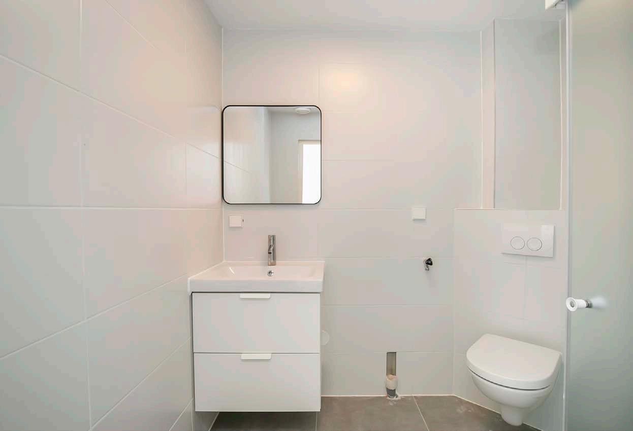 Fris betegelde badkamer met wandcloset, inloopdouche en wastafel met ladenmeubel.