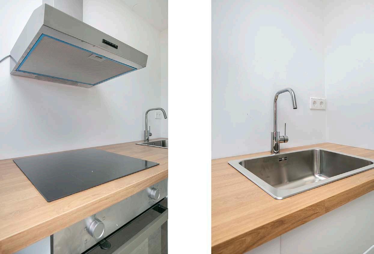 Open keuken met onder- en bovenkasten en houten werkblad in wandopstelling, voorzien van rvs spoelbak met eengreeps mengkraan en inductie kookplaat met wasemkap. Ingebouwde combioven/ magnetron en opstelplaatsen koel-/ vriescombinatie en vaatwasser of wasmachine.