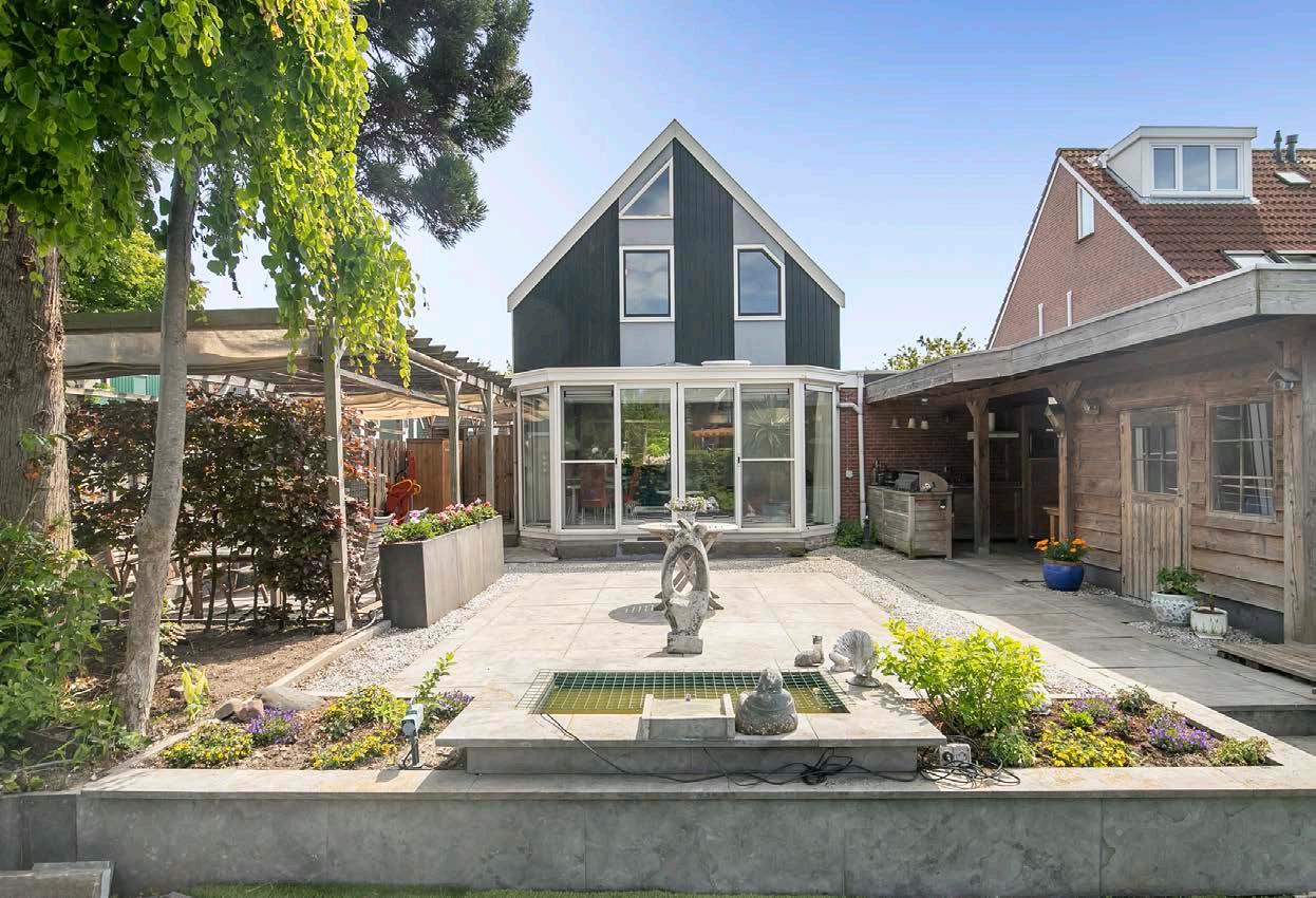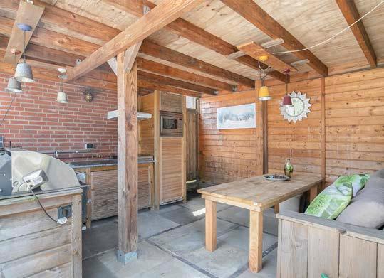 De achtertuin van deze woning is werkelijk een pareltje. Met een overkapping, buitenkeuken en houten berging kun je optimaal genieten van het buitenleven, weer of geen weer en direct aan open vaarwater.