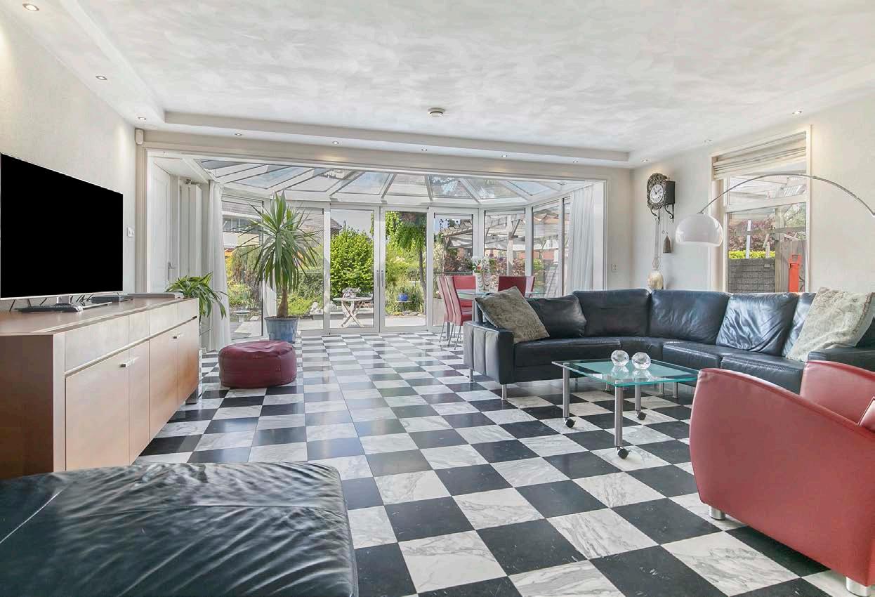 We lopen door naar de royale woonkamer. De woonkamer is heerlijk licht dankzij de grote uitbouw aan de achterzijde. Deze uitbouw is rondom voorzien van ramen, heeft een glazen dak en openslaande deuren naar de tuin. Er ligt een tegelvloer en de wanden zijn netjes afgewerkt.