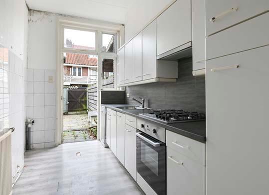 Ook heb je vanuit de hal toegang tot een gesloten keuken waarin een recht keukenblok is geplaatst. Ook hier kun je een geheel nieuwe keuken plaatsen.