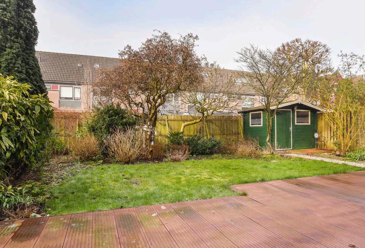 De achtertuin is mooi ruim en deze is gelegen op het zonnige zuidwesten, waardoor je hier optimaal van het buitenleven kunt gaan genieten. De tuin is ingericht met bestrating, gazon en borders met diverse vaste beplanting. Verder ben je hier nog voorzien van een houten tuinhuisje.