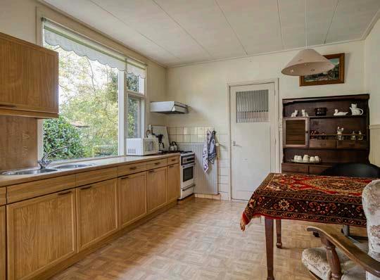 De lichte woonkamer met eethoek aan de voorzijde biedt vrij uitzicht over de landelijke omgeving. De keuken is ruim van formaat en kan naar eigen smaak worden gemoderniseerd.
