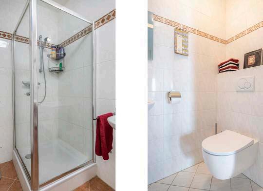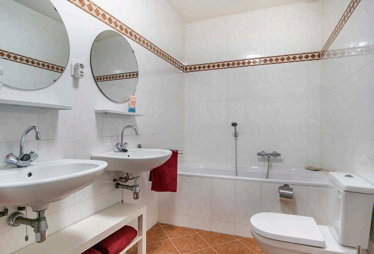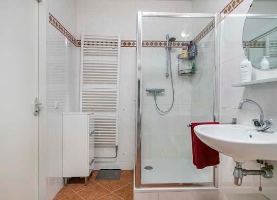 De badkamer is volledig betegeld en beschikt over een douche, ligbad, toilet en twee wastafels.