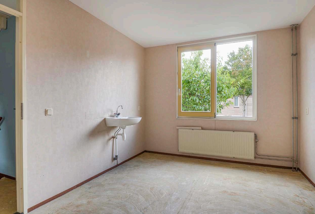Aan de voorzijde vind je de open keuken, waar een basis keukenblok zonder apparatuur is geplaatst.