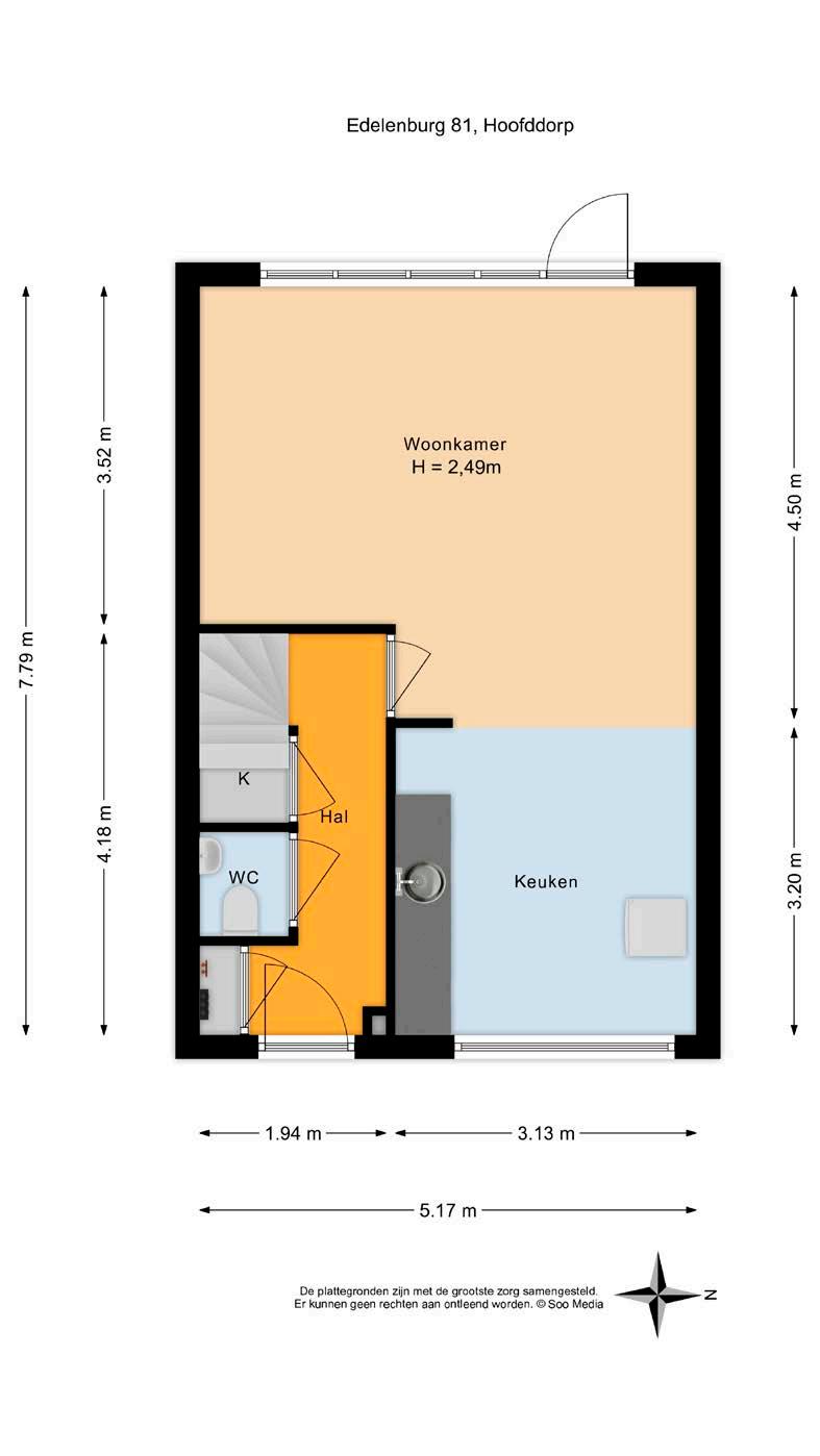 Vanuit de hal van goed formaat, met de meterkast, toilet met fonteintje, trapkast en vaste trap naar de verdieping komen we de woonkamer binnen. De hoeveelheid licht en ruimte zullen straks, wanneer jij hier een nette vloer hebt gelegd, de wanden hebt voorzien van warme tinten en jouw favoriete meubels hebt geplaatst, zorgen voor een fijne en ontspannen sfeer waarin je thuis zult komen als nooit te voren.