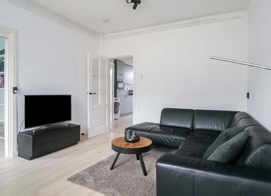 De woonkamer is dankzij de vele ramen aan de voorzijde aangenaam licht en deze is ruim opgezet waardoor er voldoende ruimte is voor een grote zithoek waar je je terug kunt trekken om te ontspannen. Er is een authentieke schouw aanwezig en door de erker is er ook meer lichtinval in de kamer. De woonkamer is verder strak en licht afgewerkt met witte wanden en een laminaatvloer die door het gehele appartement ligt. Door deze afwerking kan je hier met verschillende interieurstijlen uit de voeten.
