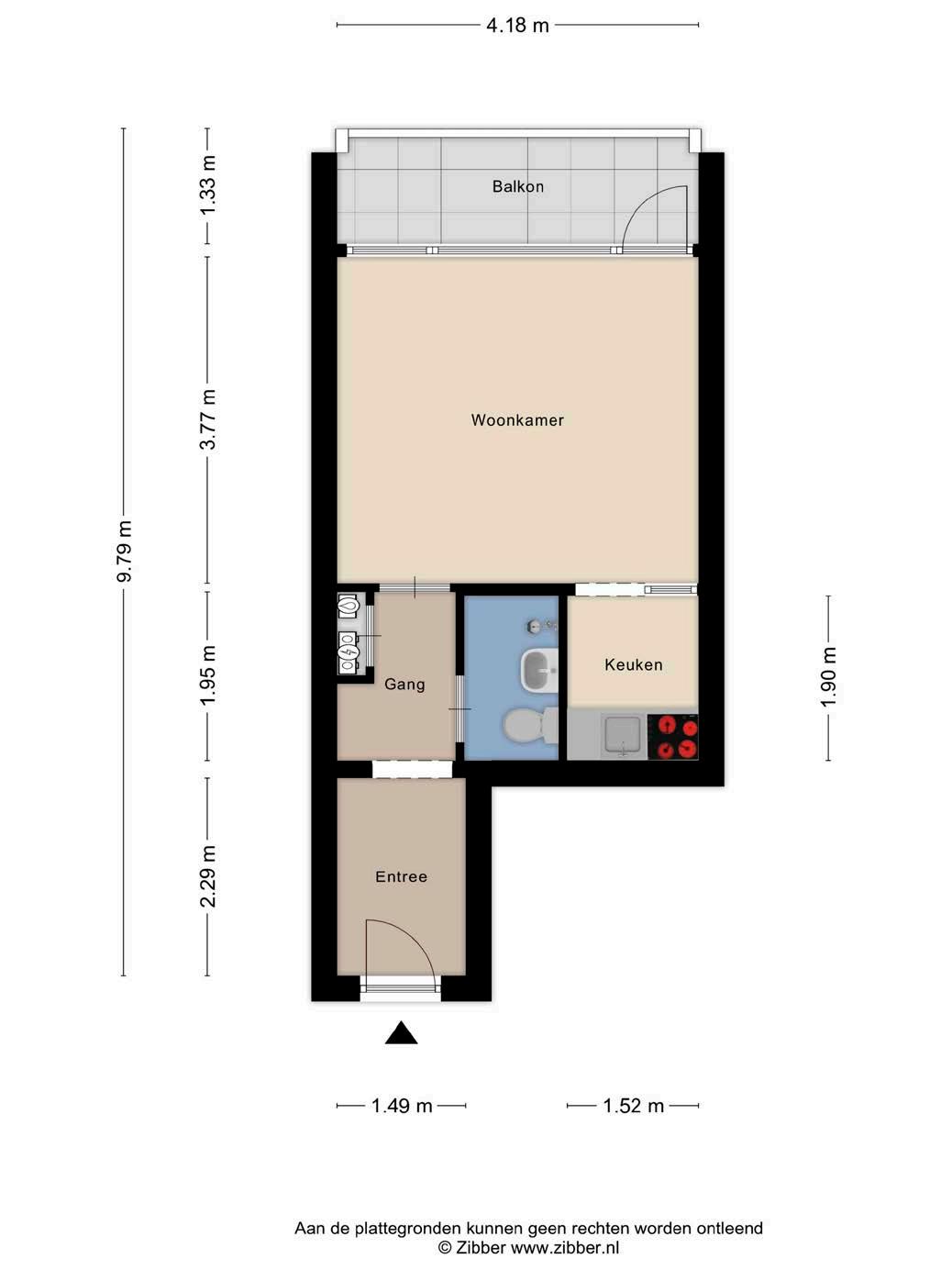 Eenvoudige afwerking met een hal die toegang geeft tot de badkamer en de woon-/slaapkamer met een half open keuken.