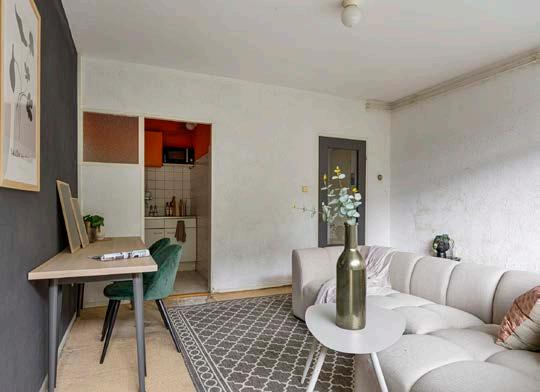 De woon-/slaapkamer straalt door het licht dat via de grote ramen naar binnen stroomt, en de half open keuken maakt de ruimte nog uitnodigender. De huidige eenvoudige afwerking biedt jou de kans om je creativiteit de vrije loop te laten en het appartement geheel naar eigen wens in te richten.