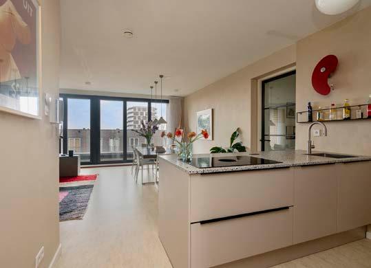 Het strakke design integreert naadloos met de moderne esthetiek van het appartement, waardoor de keuken niet alleen een functionele, maar ook een visuele aanwinst is. Hier wordt koken een genot en staat de keuken centraal in het dagelijks leven van de bewoners.