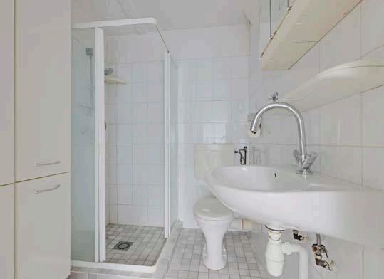 De betegelde badkamer is geplaatst vanuit de bouw en is voorzien van een toilet met fontein, douche en handdoekradiator.