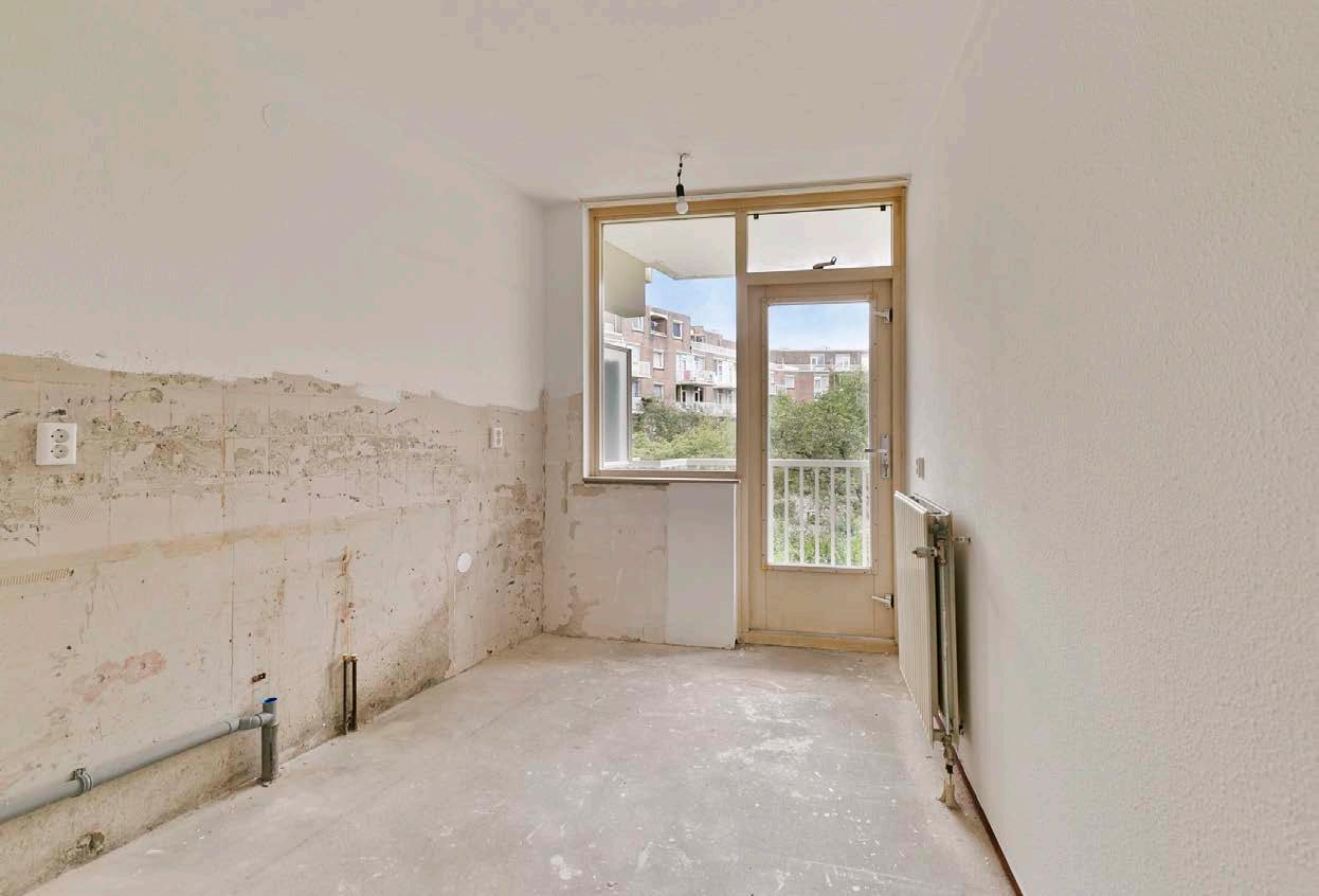 De gesloten keuken bevindt zich aan de achterzijde en ook deze dient gemoderniseerd te worden. De ruimte is lekker licht dankzij de deur met toegang tot het balkon. Hoe ziet jouw droomkeuken eruit?