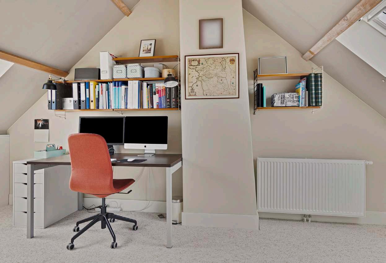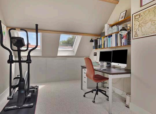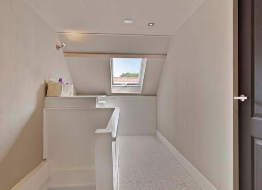 De tweede verdieping heeft op de overloop plek voor een wasmachine en droger. De ruime zolderkamer is prima te gebruiken als extra slaapkamer of studeerkamer. Ook is er een makkelijk toegangbare opbergruimte en praktische knieschotten aan weerszijde van de kamer.