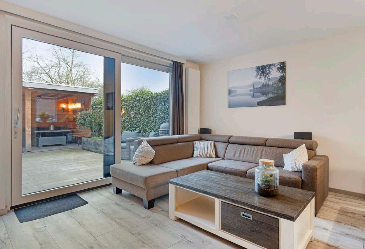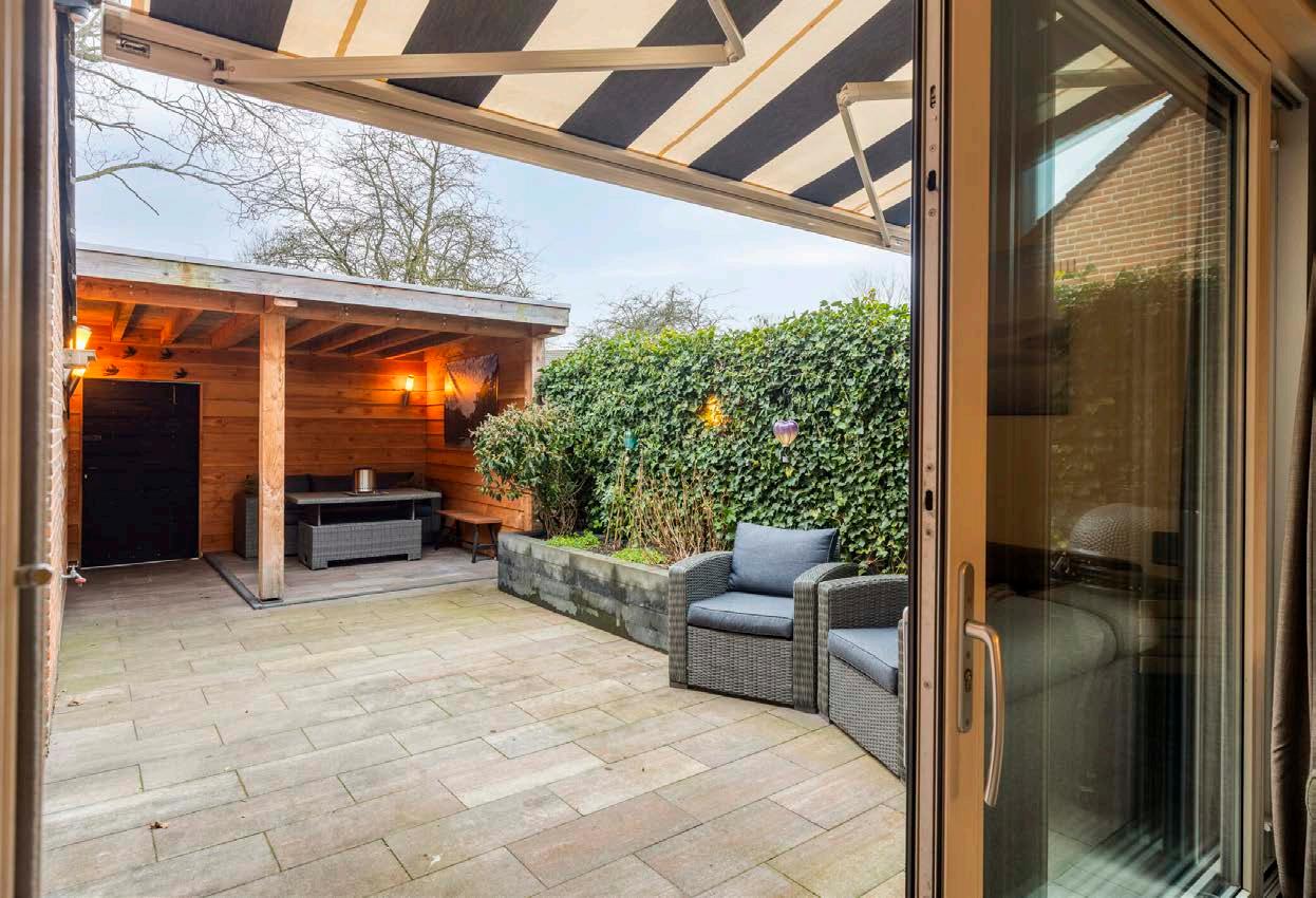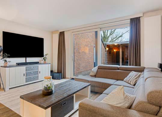De woonkamer voelt extra ruim en licht door de grote schuifpui naar de tuin. Deze verbindende factor tussen binnen en buiten zorgt voor een heerlijke sfeer, perfect voor lange zomerdagen of gezellige winteravonden.