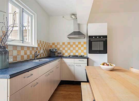 We lopen door naar de open keuken die in een praktische L-opstelling is geplaatst waardoor je over voldoende werk- en opbergruimte beschikt. De keuken is ingedeeld met een oven, koelkast en een 4-pits gasfornuis met afzuigkap.