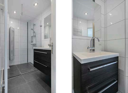 De badkamer en de toiletruimte zijn separaat van elkaar. Beide ruimte genieten van dezelfde moderne en strakke afwerking. De badkamer is uitgerust met een heerlijk inloopdouche met sun shower en een wastafelmeubel met opbergruimte en spiegel.