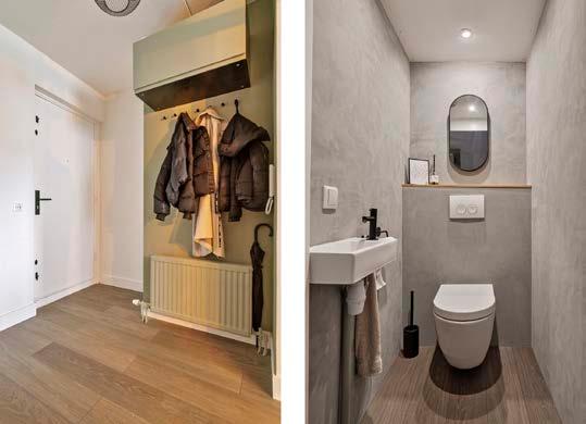 De badkamer is volledig betegeld en uitgerust met een ligbad met douche, een wastafel en een aansluiting voor witgoed. Het toilet, voorzien van een fonteintje, bevindt zich in een aparte ruimte naast de badkamer, wat extra privacy en gemak biedt.