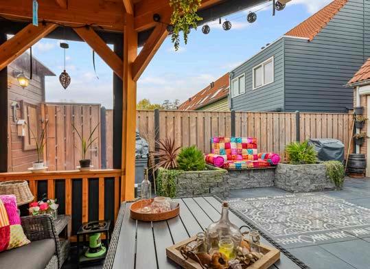 Achter het huis ligt een zonnige tuin op het zuid westen, compleet met heerlijke terrasoverkapping (2021). Zelfs bij iets minder mooi weer is het hier dus goed vertoeven. De tuin is sfeervol aangelegd met een mooie tuintegel en borders met diverse beplan ting aan de zijde. Achter in de tuin staat nog een zeer ruime berging, ideaal voor bijvoorbeeld het stallen van de fietsen, gereedschap, tuinmeubilair en een eventuele extra koelkast/vriezer.