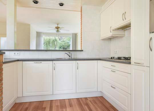 Loop door naar de half open keuken met vanaf het aanrecht zicht op de woonkamer. Het keukenblok staat in een riante hoekopstelling en is voorzien van een gaspit, tapkraan, combioven en een koelkast. Het plafond is hier verlaagd en afgewerkt met ver lichting.