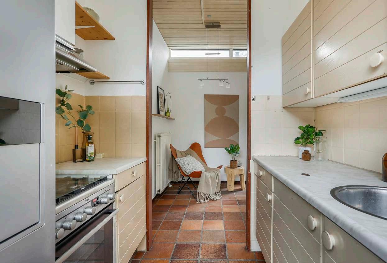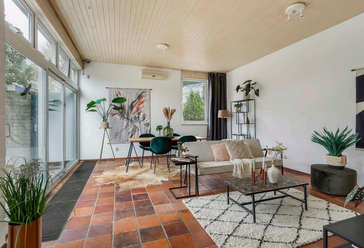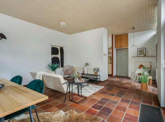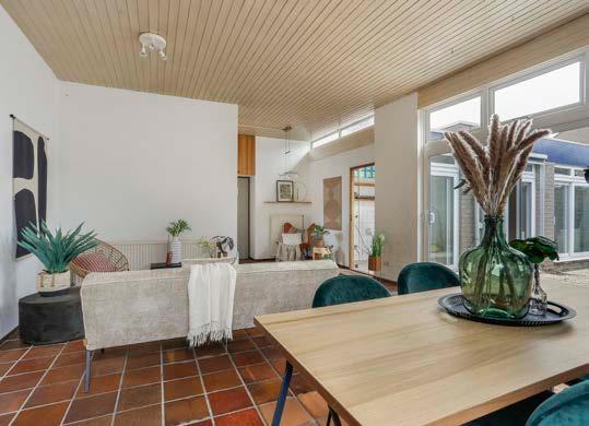 Zodra u de woonkamer binnenkomt vult een bijzondere hoeveelheid daglicht de kamer. Deze ruimte beschikt over een extra hoog plafond en via een schuifpui bereikt u de tuin. Daarnaast is het geheel afgewerkt met lichte wanden en een nette plavuizen vloer. De aanwezige airco zorgt in de zomerdagen voor een stukje verkoeling.