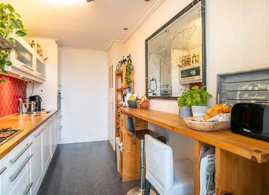 Vanuit de hal krijg je toegang tot de gezellige keuken. De keuken is tijdloos, goed onderhouden en voorzien van een hardhouten werkblad. Uiteraard beschik je hier over diverse apparatuur, te noemen: een gaskookplaat, afzuigkap, vaatwasser, oven, koelkast en een vriezer.