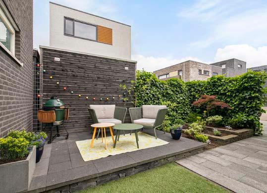 De achtertuin is mooi aangelegd en biedt ruimte voor het hele gezin.