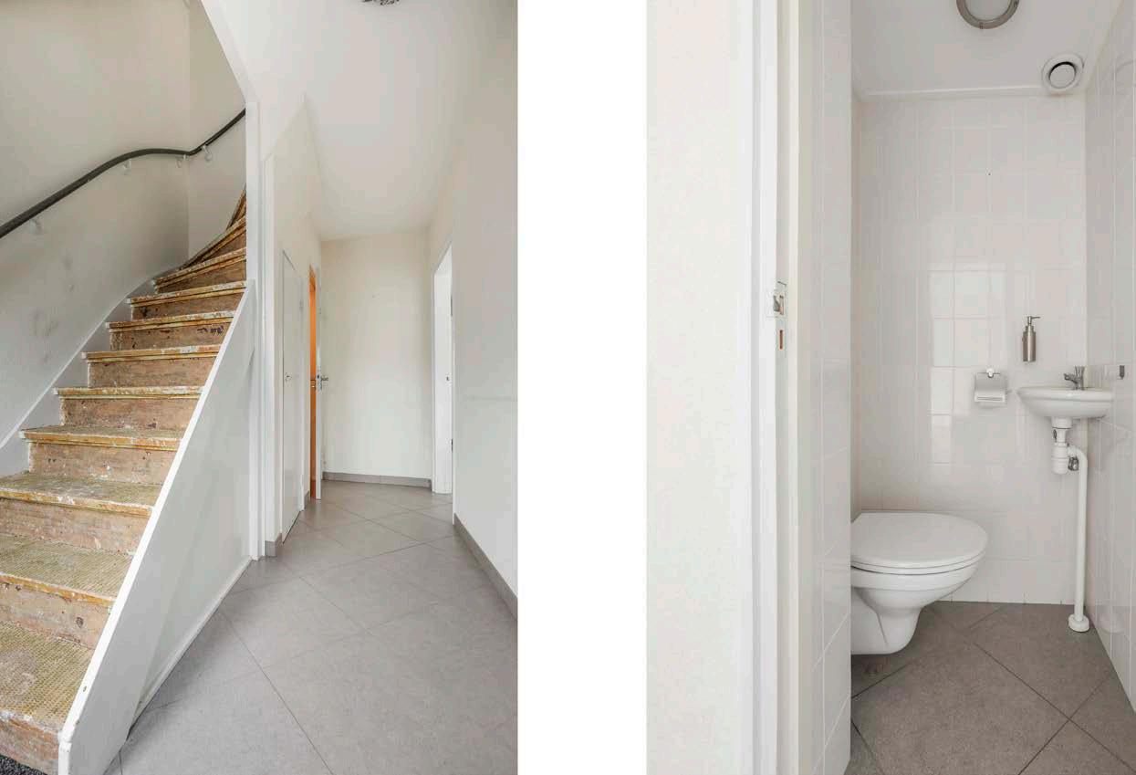 Entree, hal, meterkast met 5 groepen en 2 aardlek schakelaars, trap naar de eerste verdieping, toilet met fontein, open keuken, doorzon woonkamer.