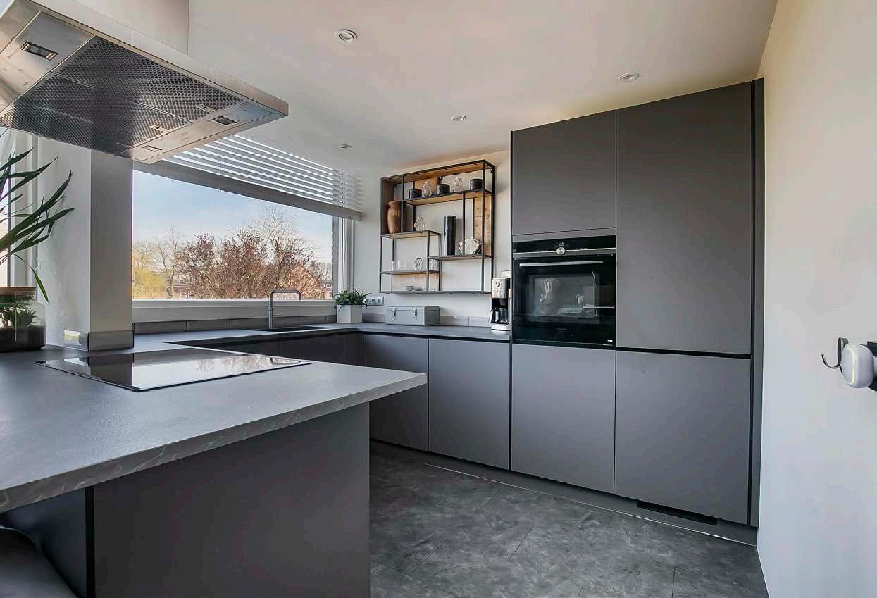 Deze moderne open keuken is de perfecte toevoeging aan jouw huis. Met een strakke afwerking in donkere kleurstelling geeft deze keuken de woning een luxe uitstraling. Het kookschiereiland is niet alleen ideaal om te koken, maar biedt ook de mogelijkheid om gezellig samen te eten. De ruimte is ingedeeld met diverse apparatuur, zoals een inductieplaat, een Quooker voor het direct verwarmen van water, een koel/vriescombinatie en een vaatwasser om na het koken welverdiend tot rust te komen. De keuken is een eyecatcher in je woning en voegt zeker waarde toe aan jouw woongenot.