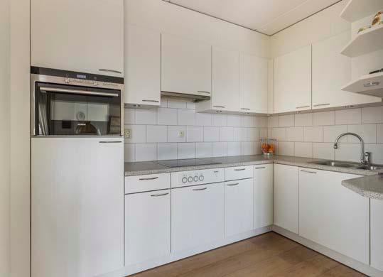 Aansluitend bevindt zich de open keuken. Deze is geplaatst in een praktische L-opstelling en u beschikt je over voldoende kast- en werkruimte. De keuken is momenteel ingedeeld met een 4 pits elektrische kookplaat, combi magnetron en een koelkast.