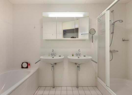 De badkamer is van grond tot plafond betegeld met een witte vloer- en wandtegel, hierdoor oogt de ruimte verzorgd. De indeling bestaat uit twee wastafels, een bad en een douchecabine. Het toilet is gescheiden van de badkamer en bevindt zich aan de hal. Hiernaast vindt u ook de witgoedaansluiting in een aparte kast die tevens kan dienen als bergkast.