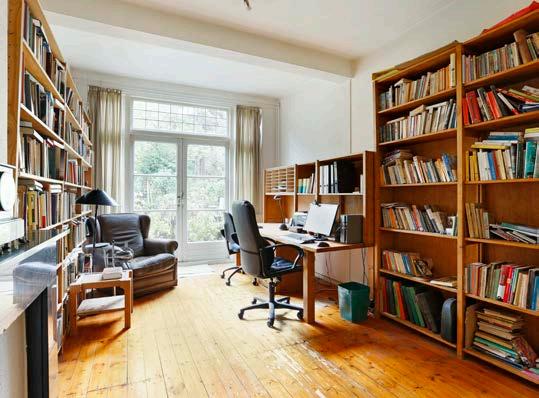 Vanuit de lichte woonkamer op de eerste verdieping hebben we een mooi uitzicht op de gracht, de ach terkamer heeft een serre met plaats voor een piano waarop onze oudste zoon ons na het avondeten op Schubert en Chopin kon trakteren, eventueel geassisteerd door dochter en jongste zoon op cello resp. viool. De studeerkamer op de benedenverdie ping is een prachtige werkruimte, ruim genoeg om de in een leven verzamelde boeken te herbergen en met openslaande deuren naar de tuin.