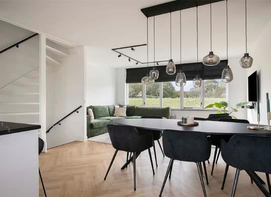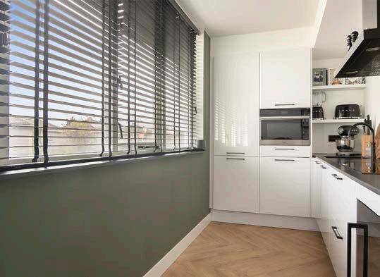 De eerste verdieping is de leefverdieping met de woonkamer en de open keuken. De ruimte is heerlijk licht en biedt volop ruimte voor een gezellige zithoek en een eethoek bij de open keuken. Het geheel is modern afgewerkt met glad stucwerk en een fraaie visgraat pvc-vloer met vloerverwarming. De gehele eerste verdieping is aan beide kanten voorzien van zonwering.