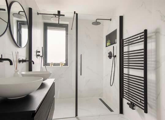 De moderne badkamer beschikt over een toilet, dubbele wastafel, handdoekradiator en dubbele inloopdouche. Er ligt vloerverwarming in de badkamer wat zorgt voor extra comfort.
