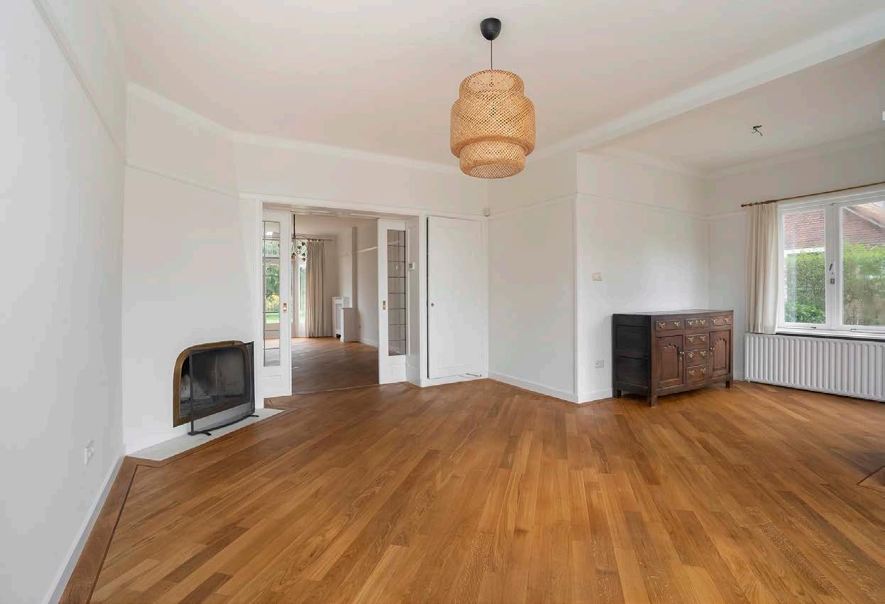 Zodra je de woonkamer binnenkomt, valt op hoe heerlijk licht deze ruimte is dankzij de ramen en de openslaande deuren naar de tuin. Je voelt je hier direct thuis! Door de gunstige afmetingen heb je bovendien volop ruimte voor een knusse zithoek bij de gezellige open haard. Het geheel is fraai afgewerkt met glad stucwerk en een lamel parketvloer.