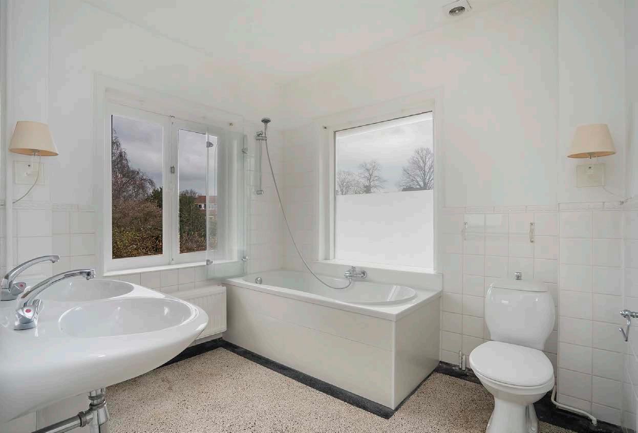 De badkamer is betegeld in een lichte kleurstelling. Het raam zorgt voor natuurlijke ventilatie en daglicht. De ruimte is ingericht met een toilet, dubbele wastafel, douchecabine en ligbad.