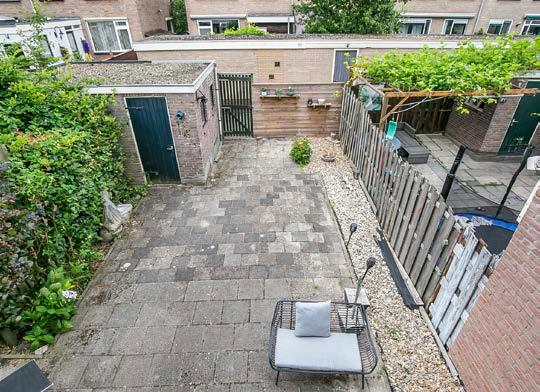 Achter ligt ook nog een redelijk onontgonnen gebied, nu betegeld en omheind. Belangstellenden met groene vingers kunnen hier de lol op, alle andere kleuren roemen vooral het onderhoudsarme aspect. De poort leidt achterom naar de stenen schuur, die is voorzien van elektra.